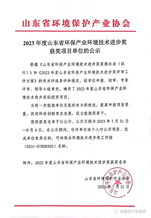 | 山東省環(huán)保產(chǎn)業(yè)環(huán)境技術(shù)進步獎 | 省級 | 山東省環(huán)境保護產(chǎn)業(yè)協(xié)會 |